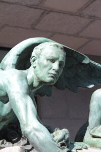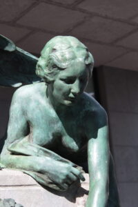 À droite de la stèle, une femme voilée, représentant la Belgique reconnaissante, tient une branche pointant vers l’inscription. À gauche, un homme ailé, symbolisant la paix ou la justice, se tient accoudé sur une gerbe de fleurs, son visage calme tourné vers les passants.