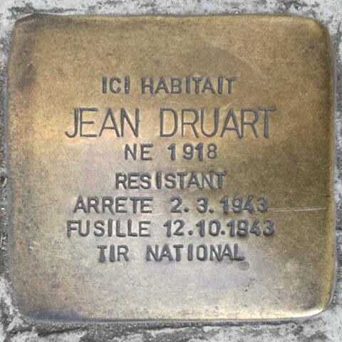 Jean Druart est né le 26 août 1918 à Anderlecht et travaillait dans la pharmacie familiale. À 22 ans, il rejoint la résistance en intégrant le réseau Tégal, un réseau de renseignements actif dès les premiers mois de l’occupation allemande en Belgique, fondé par l’officier Pierre Hauman. Ce réseau envoyait des informations stratégiques à Londres concernant des cibles militaires, logistiques, économiques et politiques. Jean Druart a effectué diverses missions d’espionnage pour le réseau jusqu’à son arrestation par la Geheime Feldpolizei le 2 mars 1943. Il fut condamné à mort le 12 juillet 1943 et fusillé au Tir national le 12 octobre 1943, à l’âge de 25 ans.